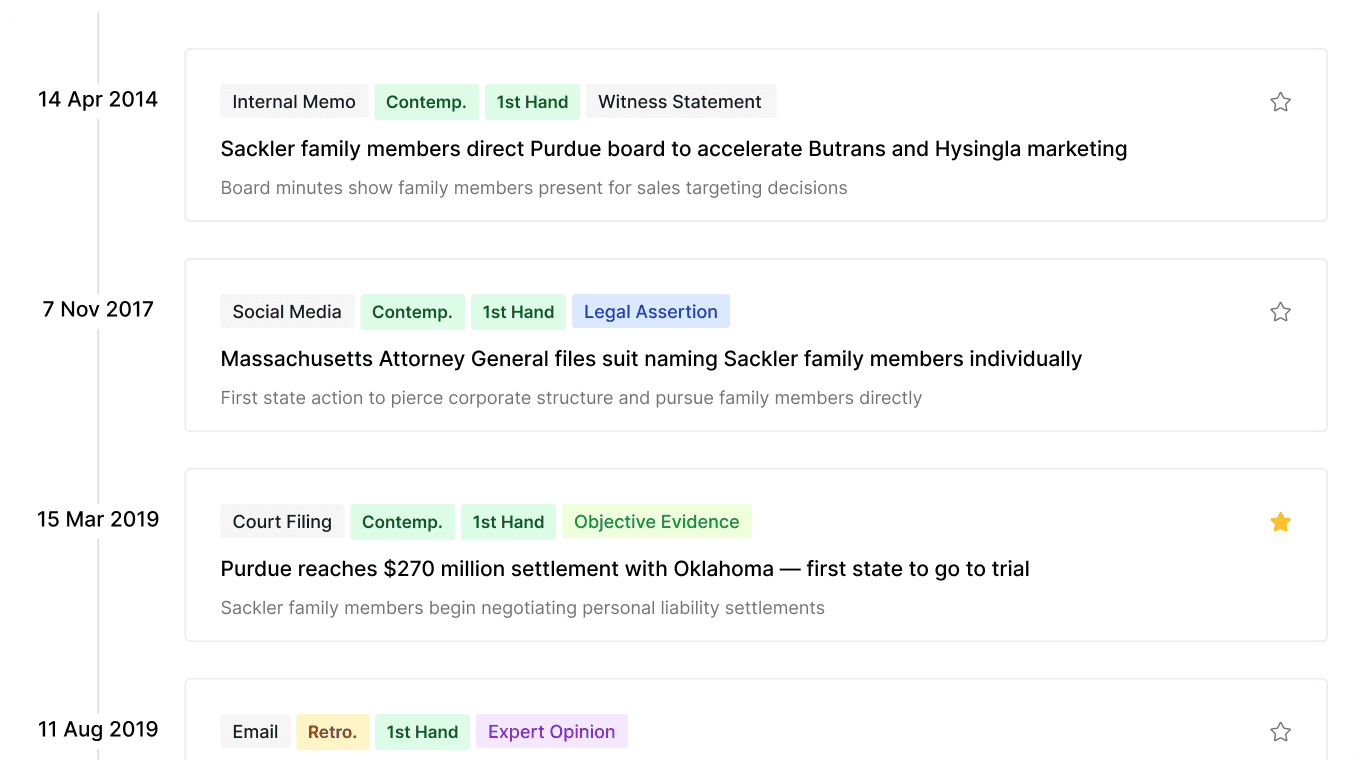 Your team reviews AI-generated outputs with full source traceability. Edit chronology entries, reclassify extractions, verify evidence links — every output is a starting point, not a final answer.